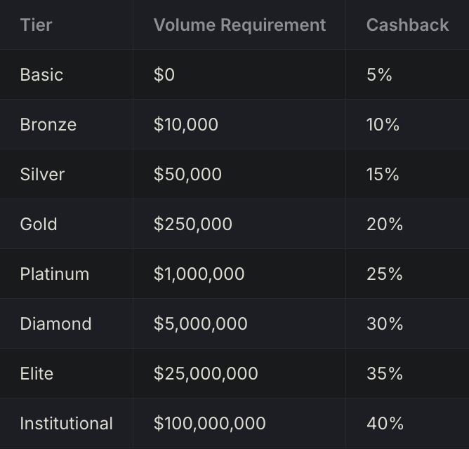 The more you trade, the higher your kickback climbs — up to 40% at the top tier.